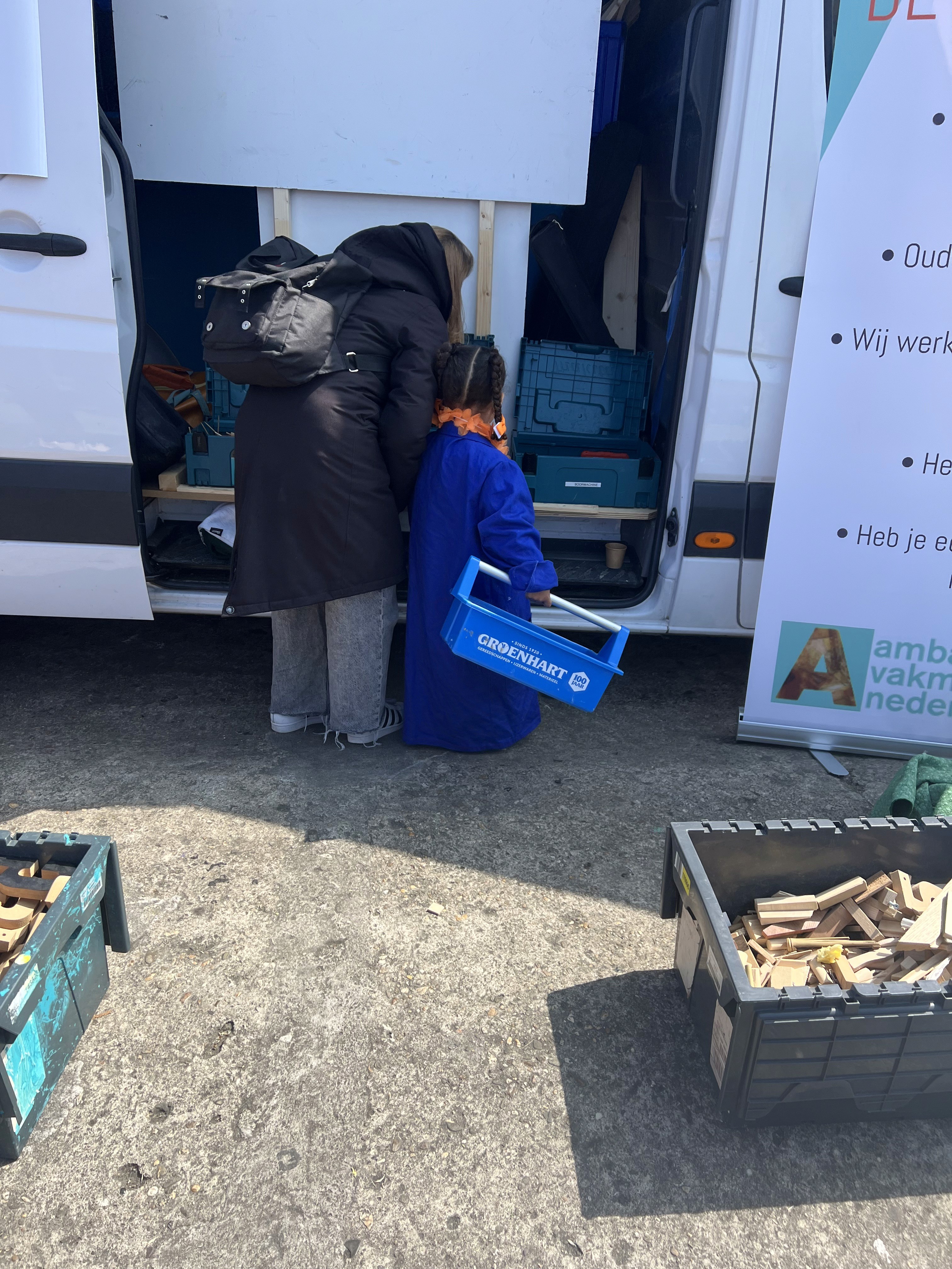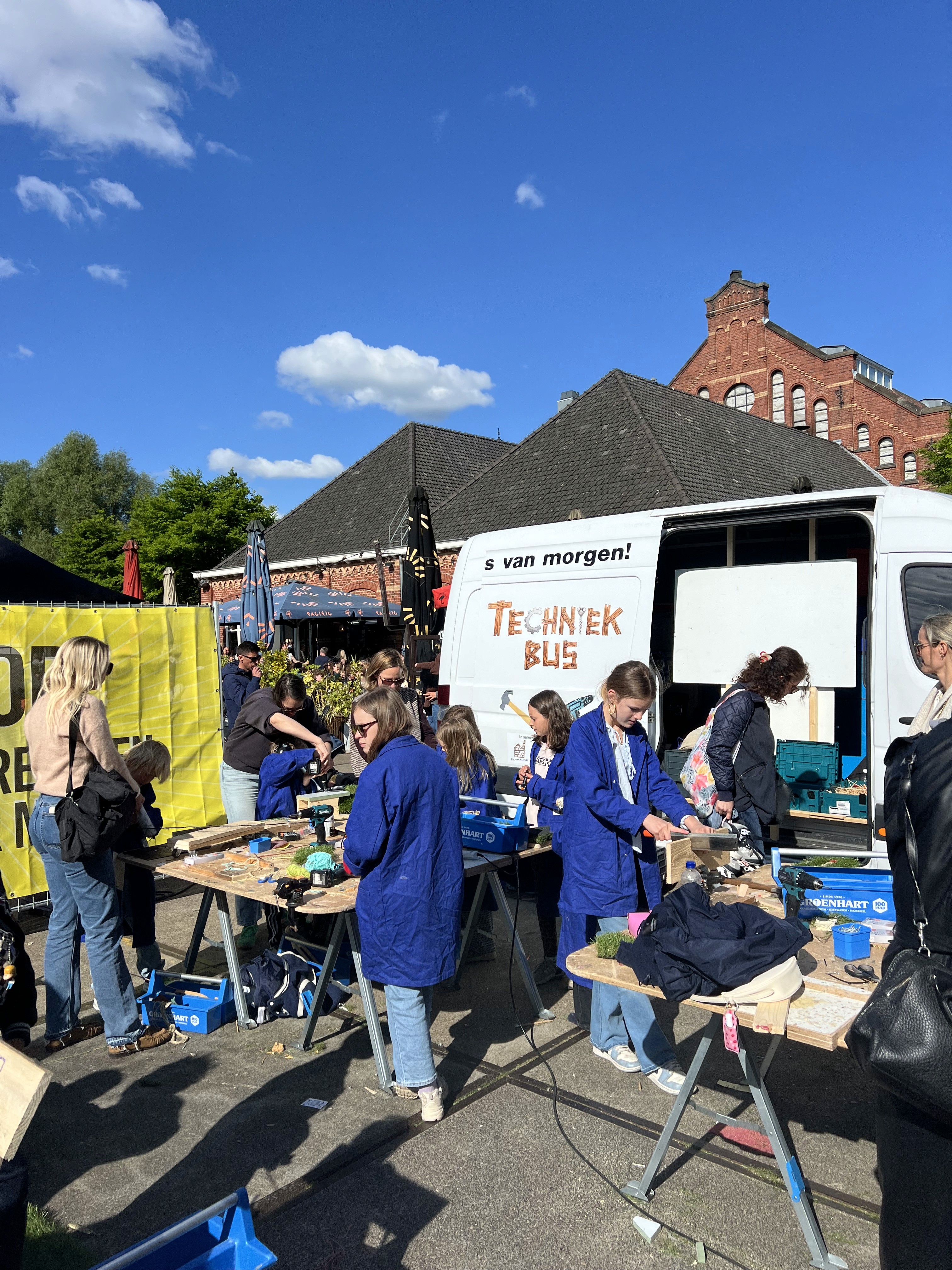 De Techniekbus zet een complete mini-werkplaats neer op jouw festival of evenement. Kinderen bouwen, ouders kijken toe of helpen mee, en iedereen gaat blij naar huis.